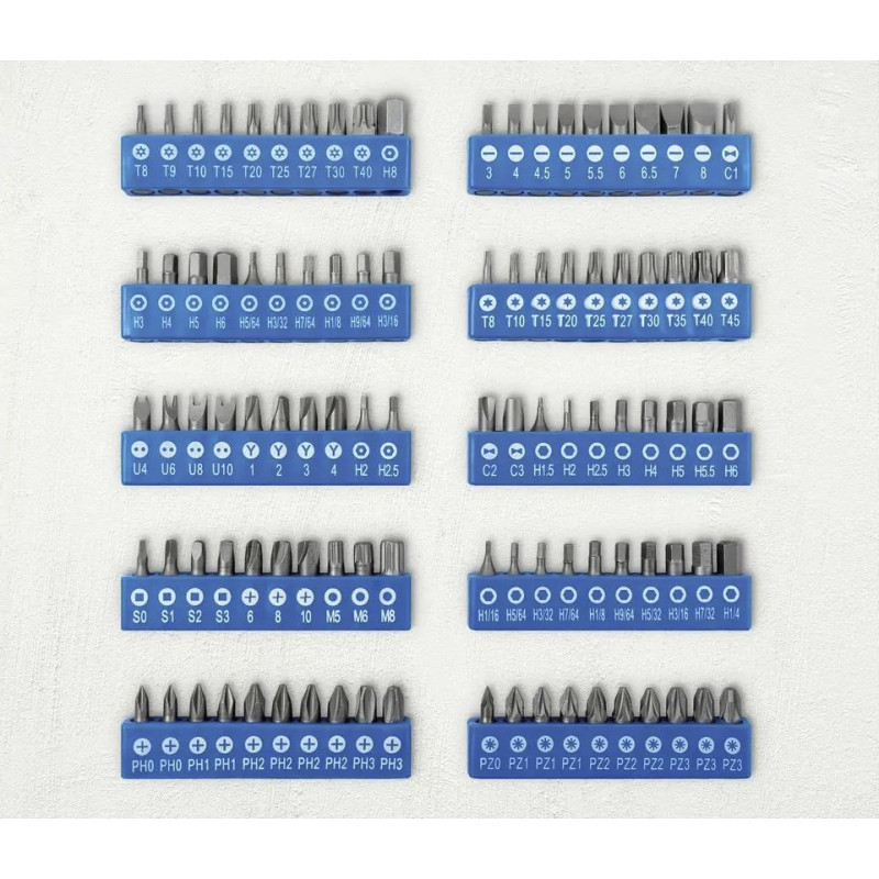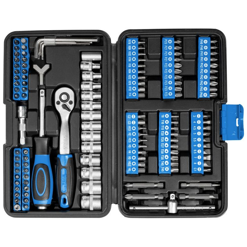 Sada náradia z chróm-vanádiovej ocele v praktickom úložnom boxe. Sada obsahuje račňu na prepínanie 1/4″ (72 zubov) s predĺžením 2″, posuvná T-rukoväť 1/4″, 13 ks nástrčkových kľúčov 1/4″, skrutkovač na držiak bitov, bitový adaptér 6,3 mm (1/4″), bit Y (hákový skrutkovač), 7 ks imbusových kľúčov, 100 ks bitových nadstavcov 6,3 mm (1/4″ triedené), 4 ks dlhé bity 50 mm.