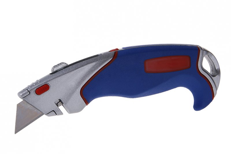 Kovový nôž s výsuvnou lichobežníkovou čepeľou, čepeľ uchytená vo vnútri tela noža na posuvnom jazdci, ergonomický tvar, tlačidlo pre jednoduchú a rýchlu výmenu čepele, drážka na rezanie šnúrky, odizolovanie vodičov…, 2 náhradné čepele.