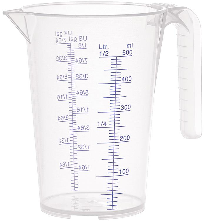 Vyhotovenie: z polypropylénu, vhodná na použitie s potravinami, priehľadná a s rozdelením rozmerov. S prelievacím okrajom pre bezpečné nalievanie. Vhodná na použitie s potravinami podľa (EÚ) č. 10/2011 a FDA § 21 CFR 177.1520.