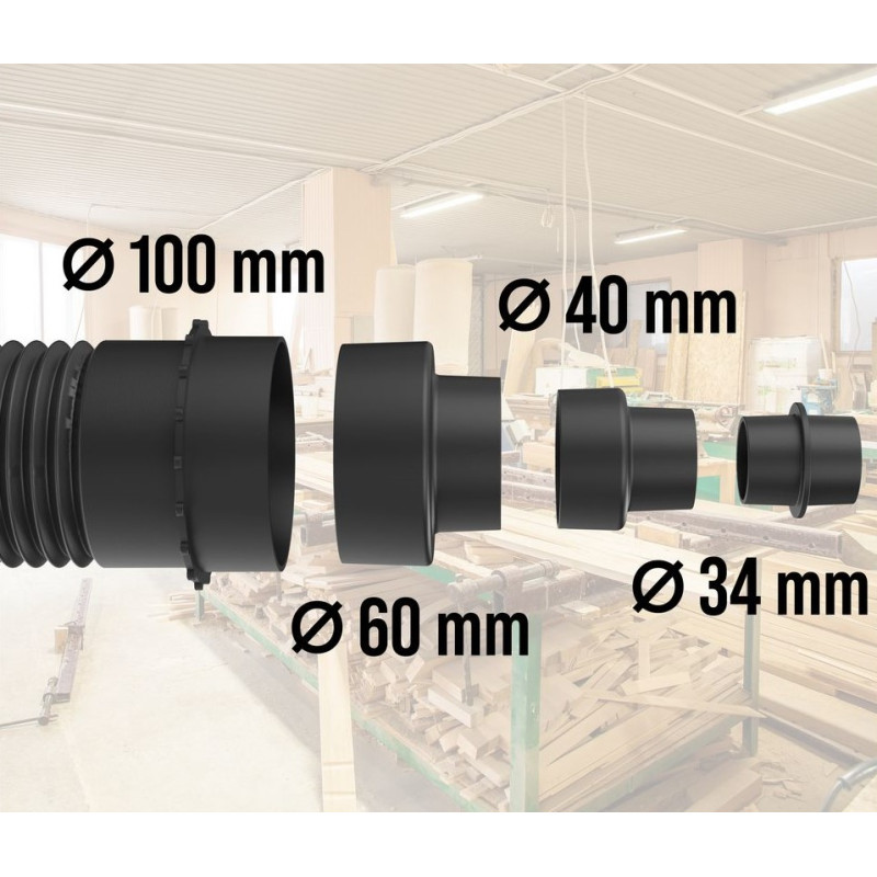 Výkonný odsávací systém na odsávanie drevených pilín, ktoré vznikajú pri pílení alebo hobľovaní. Pojazdný vďaka kolieskam, sacia hadica dlhá približne 2 m. Vhodné pre všetky drevoobrábacie stroje s pripojením na odsávanie s priemerom 10 cm. Vrátane adaptéra na všetky bežné prípojky (100/60/40/34 mm).