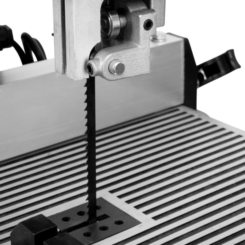 Pásová píla je presná, s nízkymi vibráciami a perfektná pre jemné práce s drevom. Kovové puzdro, hliníkové kladky pílového pásu. Hliníkový stôl výkyvný do 45°, pevný stojan s otvormi pre montáž na stôl, kovový kryt. Spínač nulového napätia, pozdĺžny a pokosový doraz. Prípojka pre odsávací systém s priemerom 49/75/100 mm.