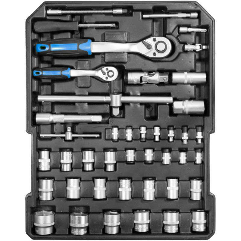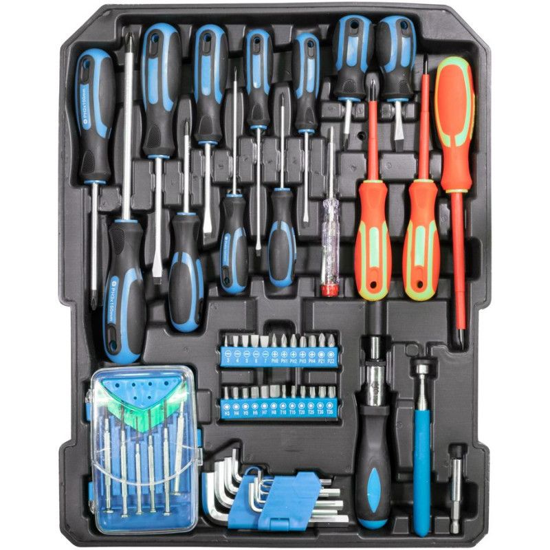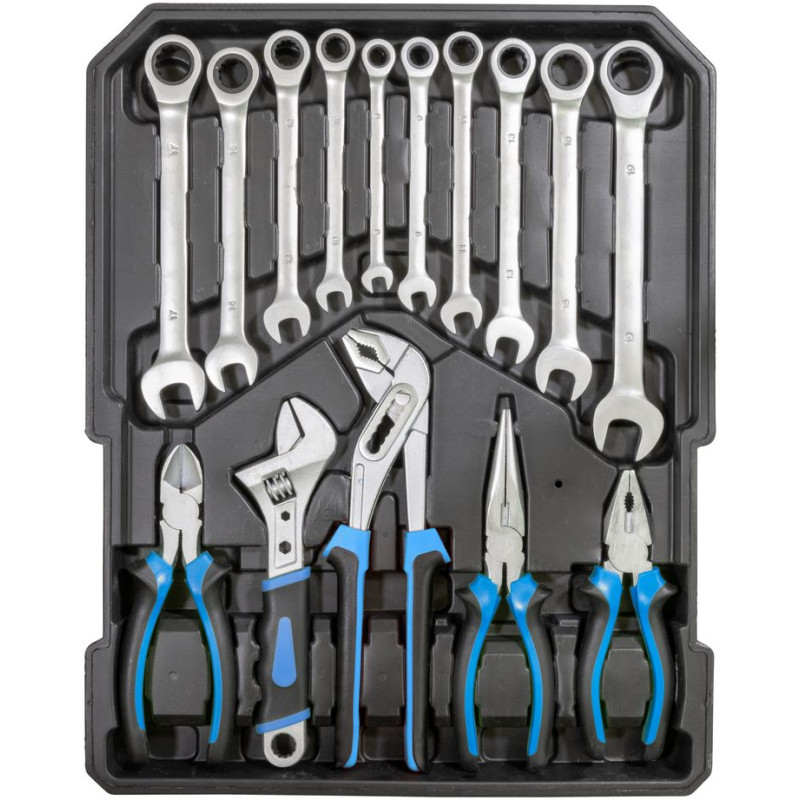 V sade sa nachádza základné náradie z chróm-vanádiovej ocele do každej domácnosti či dielne, upevňovacie svorky, kladivo 300 g, trapézový orezávací nôž, krimpovacie kliešte, univerzálne škripcové kliešte, meracie pásmo 5 m, termolepiaca pištoľ, vodováha, izolačná páska, káblové viazače, rôzne klince a skrutky.