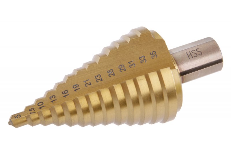 stupňovitý vrták z kvalitnej HSS ocele DIN 1412C s TiN vrstvou vrstva TiN zvyšuje odolnosť a životnosť vrtáka na vŕtanie zliatin a oceľových plátov do hrúbky 4 mm, plastu a dreva, široké drážky ľahko odvedú odvŕtaný materiál 13 stupňov – 5, 7.5, 10, 13 1