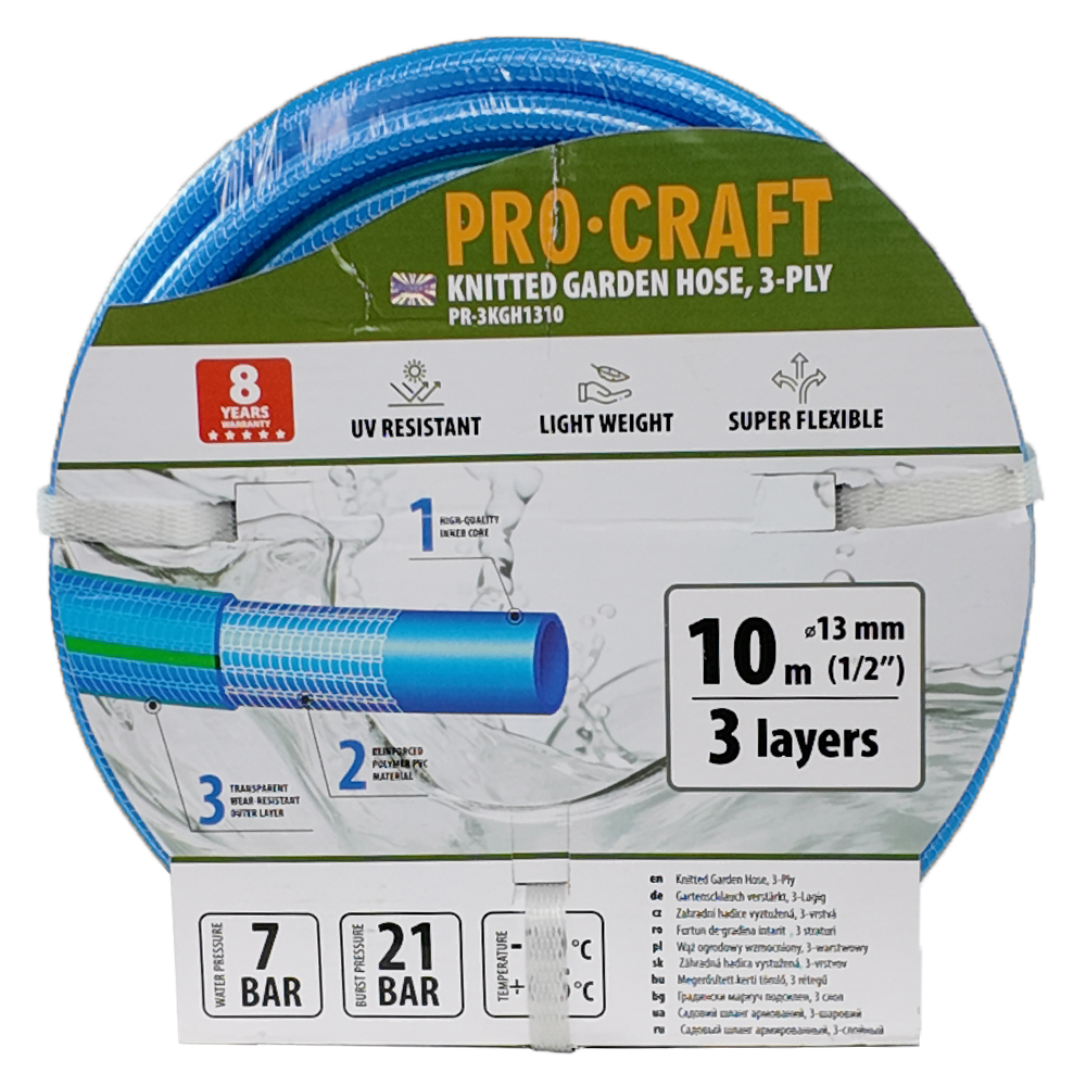 Záhradná hadica Procraft je určená na zavlažovanie a polievanie záhrad, pozemkov. Vystužená trojvrstvová záhradná hadica s tkanou výstužou má dlhú životnosť až 8 rokov. Kvalitné spracovanie hadice zaručuje vysokú odolnosť voči UV žiareniu, poveternostným vplyvom a teplotám (-10 až +65). Hadica je veľmi pružná, pevná a odolná voči poškodeniu.